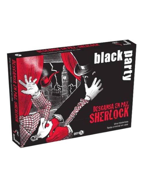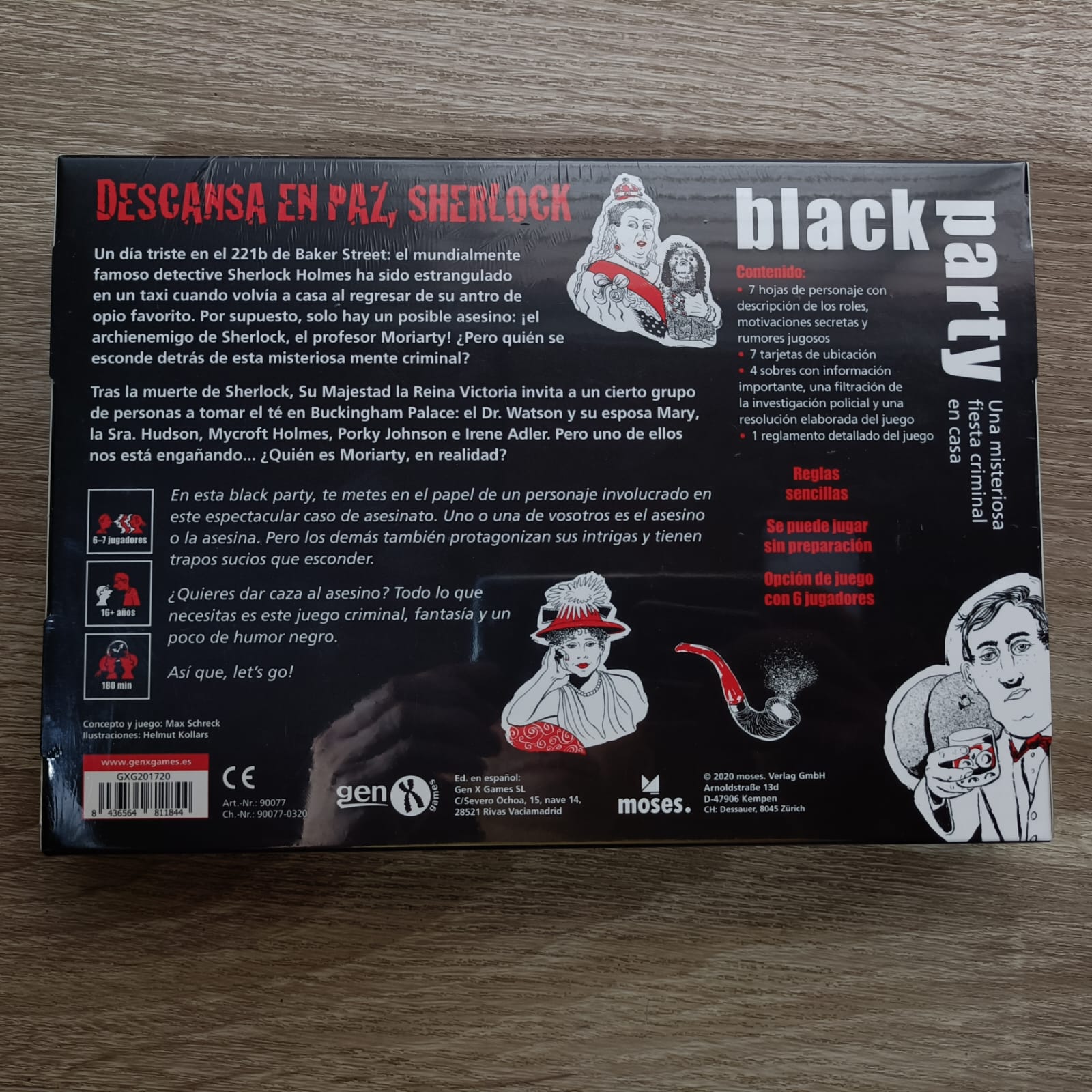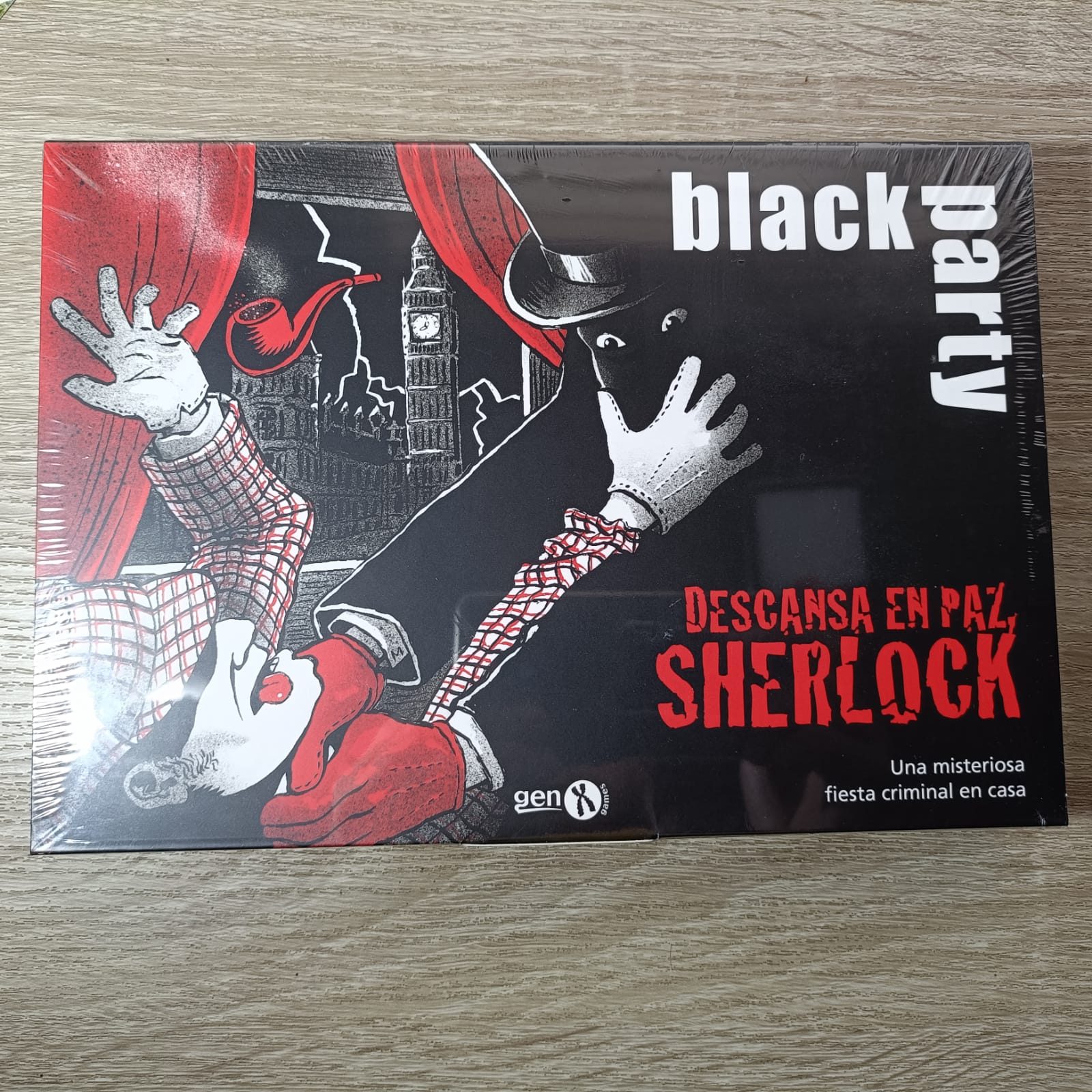 Descripción: Black Party: Descansa en Paz, Sherlock es un juego de roles ocultos, de 6 a 7 jugadores, en el que tendrás que enfrentarte a una misión muy delicada: descubrir quién ha asesinado al gran Sherlock Holmes. Nadie lo puede creer, pero el gran Sherlock Holmes ha sido asesinado, víctima de un cobarde estrangulamiento cuando regresaba a su casa. ¿Quién ha podido ser el culpable? Sin duda alguna, su archienemigo, el profesor Moriarty. Tras su muerte, la Reina Victoria ha convocado a un reducido número de personas para tomar el té en su residencia de Buckingham Palace. Entre los invitados habrá un personaje que no será quien dice ser, será el asesino o asesina… ¿Serás capaz de descubrirlo?.
